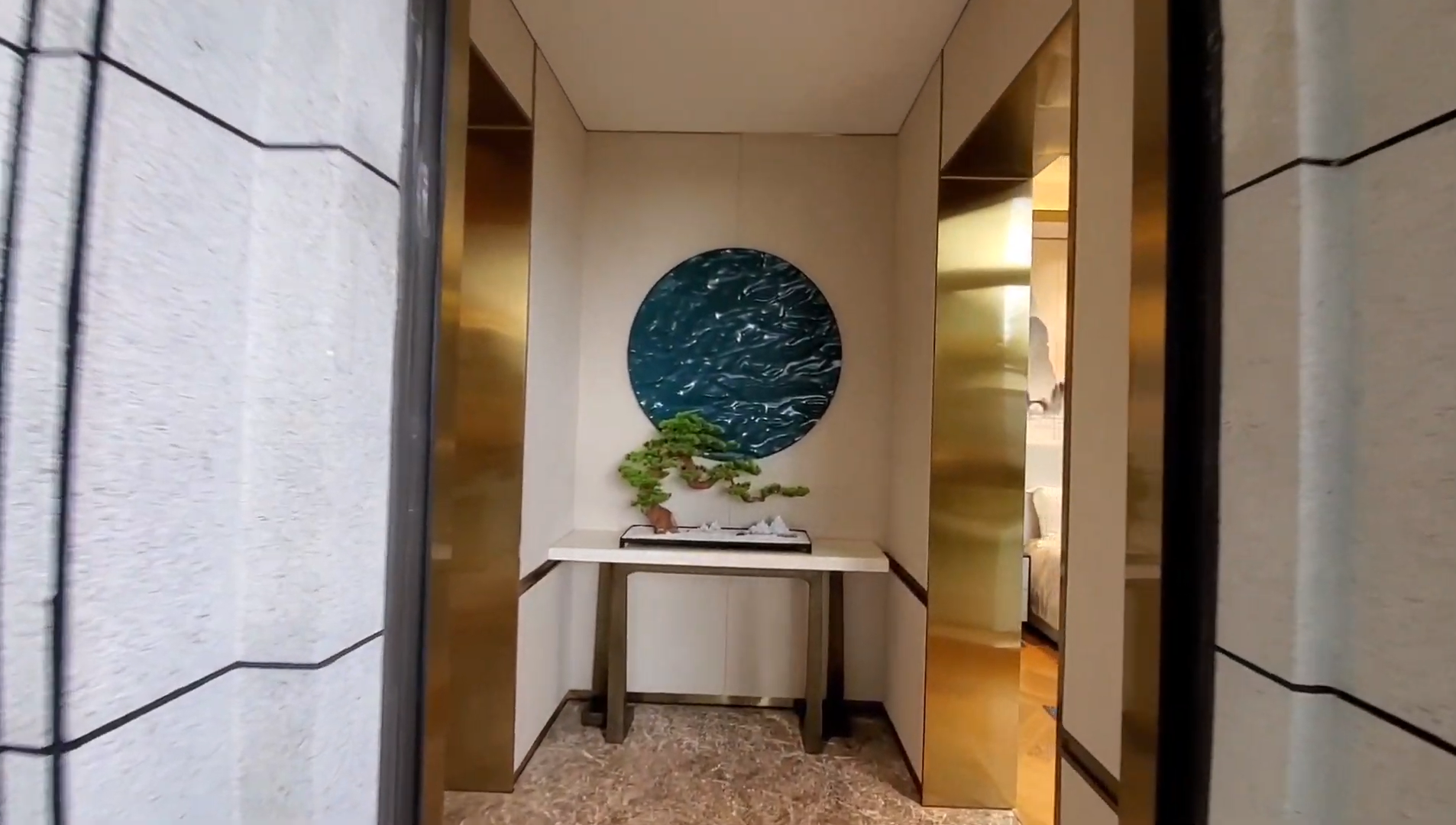 侧门进入室内,抬头的玄关空间又装饰圆形的屏风墙。