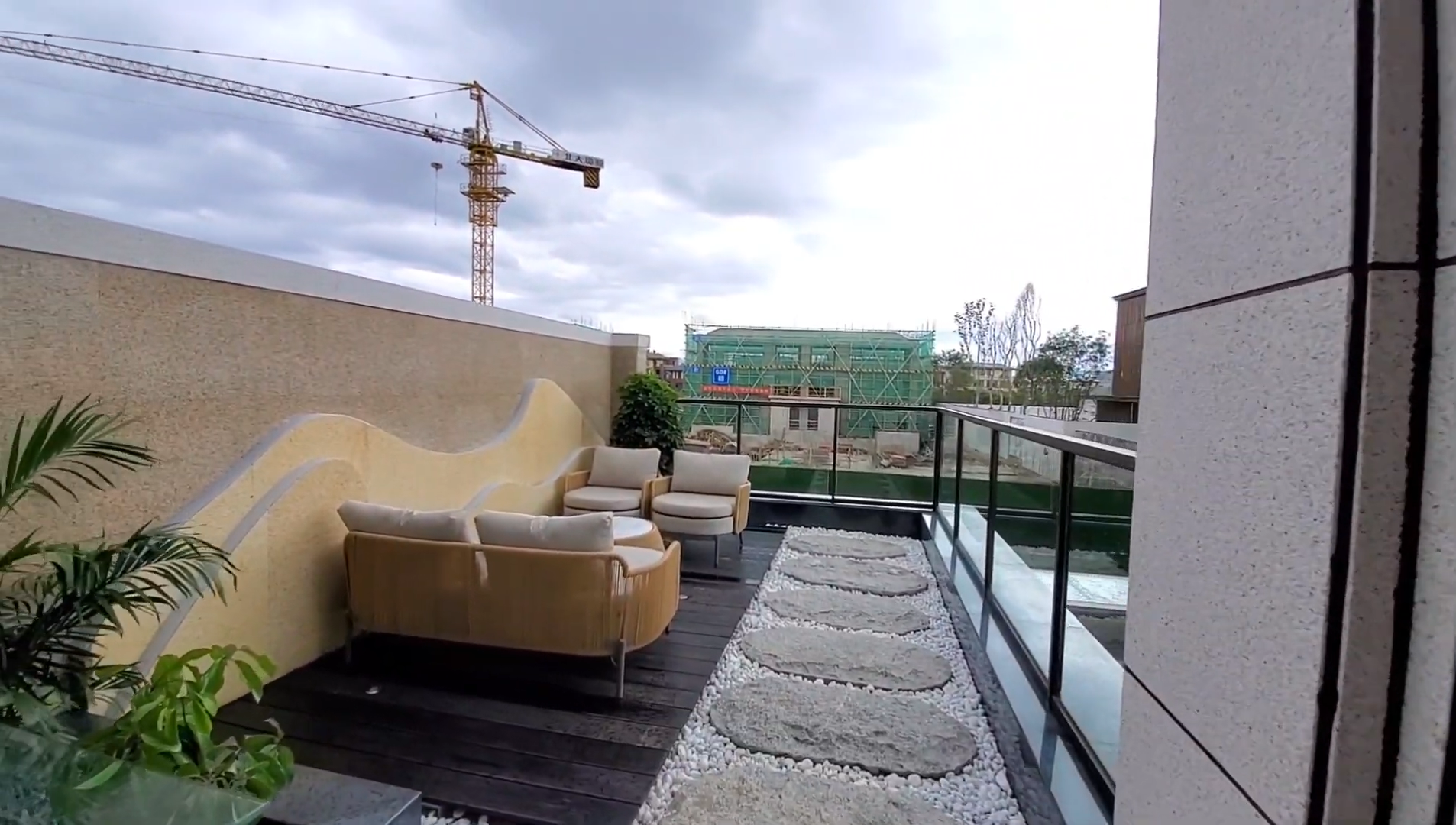 侧面突出来的走廊主人随意的放置茶几和桌椅就是一个惬意的室外活动区。