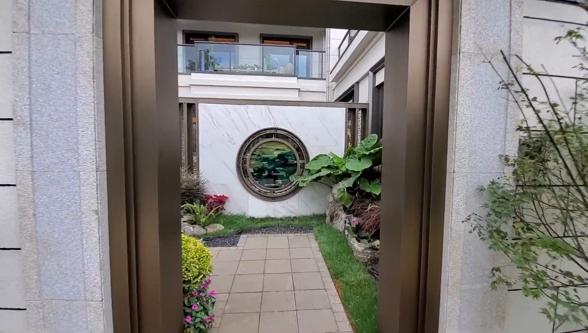 屏风左手边就是这个别墅的花园,大概100平方米左右,交工的时候花园是草坪,业主可以根据喜好自己设计。