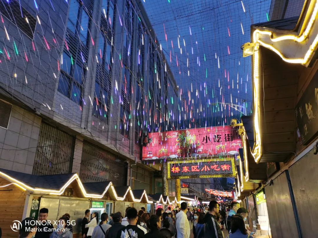 快下大雨了,夜市还这么多人。注意看高空的防护网,细节都在,这是为了防止高空抛物伤到下面逛夜市的人。